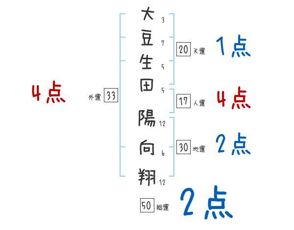 外運![]() | 大豆生田陽向翔さんの外運は33画の4つ星!権力志向でプライドが高い。勇気があり運を切り開き成功する。 生活面を象徴する運勢です。外部から受ける影響力を表し、結婚運、家庭運や職場、環境への順応性を表します。 |