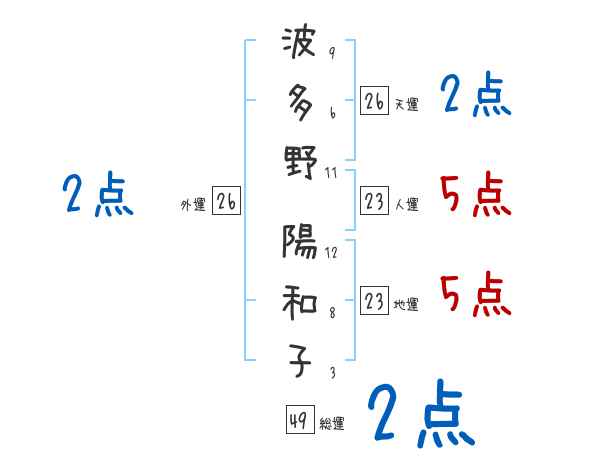 天運![]() | 波多野陽和子さんの天運は26画の2つ星!波瀾万丈かも。信頼できる人を大事にしましょう。 家系が持つ宿命的な運勢を表します。祖先から受け継いだ苗字ですので自分の力が及びません。家柄を象徴します。 |
