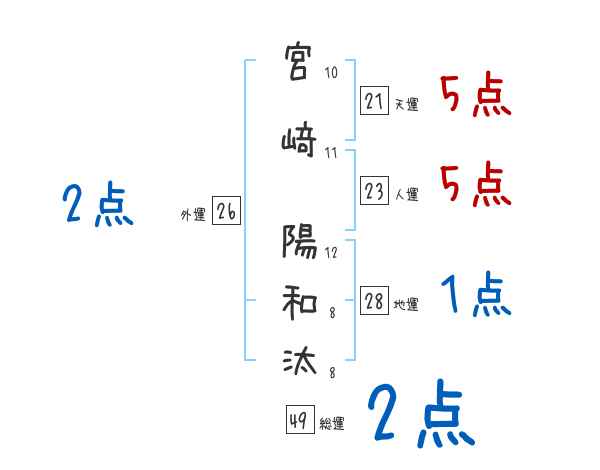天運![]() | 宮﨑陽和汰さんの天運は21画の5つ星!統率力がある。独立し成功する。名誉を手に入れる。 家系が持つ宿命的な運勢を表します。祖先から受け継いだ苗字ですので自分の力が及びません。家柄を象徴します。 |