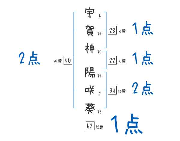 人運![]() | 宇賀神陽咲葵さんの人運は22画の1つ星!努力することが苦手ないっぽう手先が器用。芸術性にも優れる。 性格や才能などを表す2番目に重要な運勢です。人間関係や協調性、社会的な成功に影響します。主に20歳から50歳ぐらいまでの中年期の運勢を表します。 |
