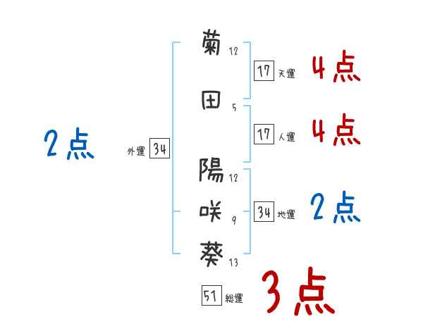 天運![]() | 菊田陽咲葵さんの天運は17画の4つ星!積極的な行動力。地位を気づき財産を手に入れる。純粋な心と直感力。 家系が持つ宿命的な運勢を表します。祖先から受け継いだ苗字ですので自分の力が及びません。家柄を象徴します。 |
