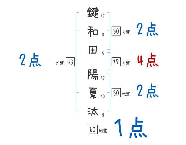 総運![]() | 鍵和田陽夏汰さんの総運は60画の1つ星!悲観的で迷いやすい。波乱が多く損をしないように。 あなたの人生を表す1番重要な運勢です。生涯を通じて影響する総合運となり、主に50歳以降の晩年期に影響を及ぼします。 |