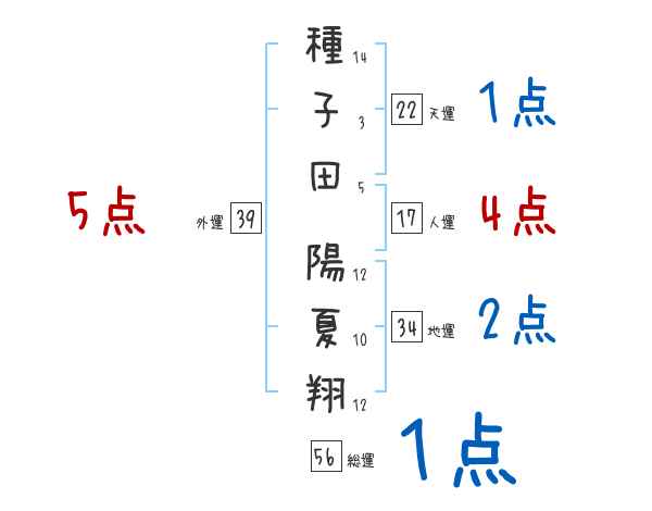 外運![]() | 種子田陽夏翔さんの外運は39画の5つ星!社交性に優れ人望が厚い。人の上に立ち成功する。 生活面を象徴する運勢です。外部から受ける影響力を表し、結婚運、家庭運や職場、環境への順応性を表します。 |