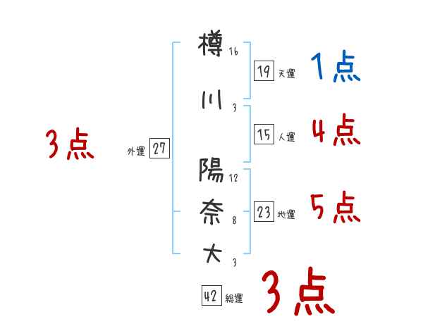 外運![]() | 樽川陽奈大さんの外運は27画の3つ星!頭脳明晰だが強情で摩擦が多い傾向。孤立に注意。 生活面を象徴する運勢です。外部から受ける影響力を表し、結婚運、家庭運や職場、環境への順応性を表します。 |