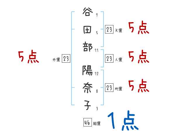 総運![]() | 谷田部陽奈子さんの総運は46画の1つ星!迷走することが多く苦労するかも。目先のことにとらわれないように。 あなたの人生を表す1番重要な運勢です。生涯を通じて影響する総合運となり、主に50歳以降の晩年期に影響を及ぼします。 |