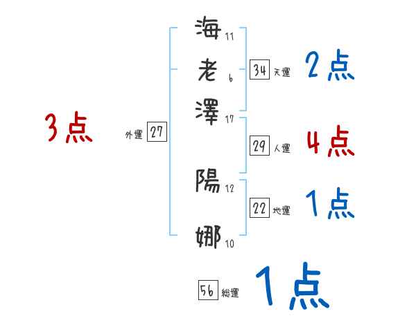 総運![]() | 海老澤陽娜さんの総運は56画の1つ星!消極的で無気力になりがち。誠実な気持ちが必要でしょう。 あなたの人生を表す1番重要な運勢です。生涯を通じて影響する総合運となり、主に50歳以降の晩年期に影響を及ぼします。 |