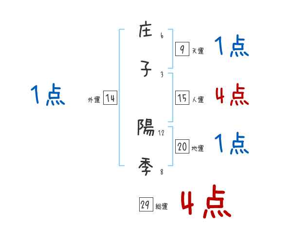 天運![]() | 庄子陽季さんの天運は9画の1つ星!消極的で才能を発揮することが苦手なことも。周りの意見に耳を傾けましょう。 家系が持つ宿命的な運勢を表します。祖先から受け継いだ苗字ですので自分の力が及びません。家柄を象徴します。 |