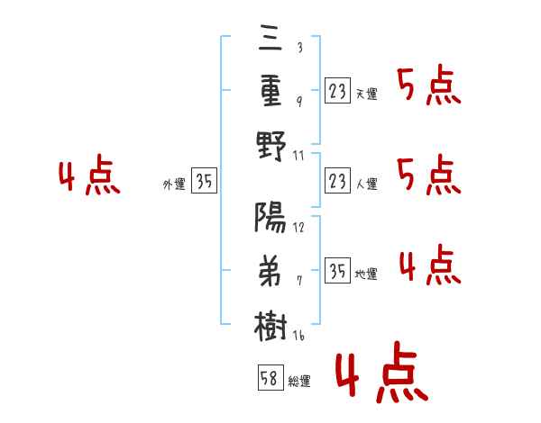 天運![]() | 三重野陽弟樹さんの天運は23画の5つ星!想像力に優れ活力がある。一代で成功し名誉を手に入れる。 家系が持つ宿命的な運勢を表します。祖先から受け継いだ苗字ですので自分の力が及びません。家柄を象徴します。 |