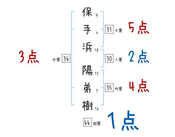 天運![]() | 保手浜陽弟樹さんの天運は31画の5つ星!社交性があり判断力に優れる。順風満帆な人生で円満な生活。 家系が持つ宿命的な運勢を表します。祖先から受け継いだ苗字ですので自分の力が及びません。家柄を象徴します。 |