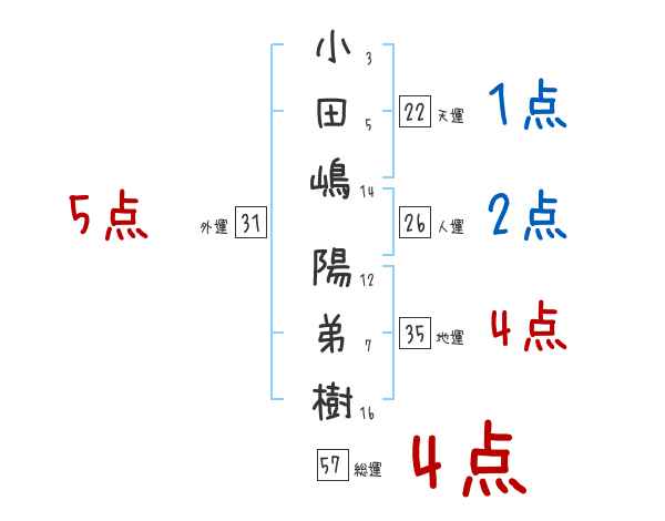 総運![]() | 小田嶋陽弟樹さんの総運は57画の4つ星!向上心があり人望がある。地位を得る。 あなたの人生を表す1番重要な運勢です。生涯を通じて影響する総合運となり、主に50歳以降の晩年期に影響を及ぼします。 |