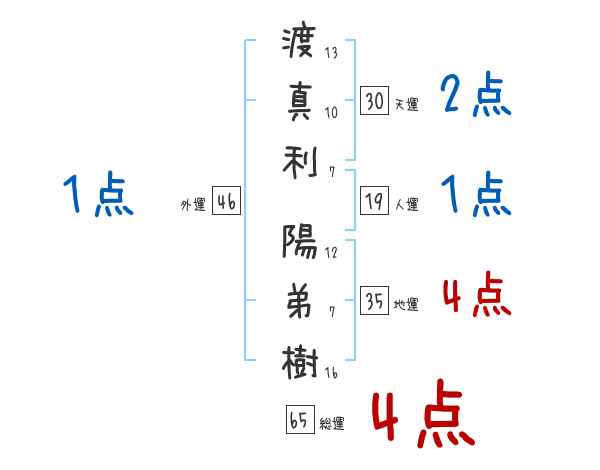 地運![]() | 渡真利陽弟樹さんの地運は35画の4つ星!温厚な性格で感受性が高い。穏和な性格で人望が厚い。 個性を表す基礎的な運勢です。性格形成や対人関係、行動力など家庭環境に影響されます。主に誕生してから20歳くらいまでの若年期の運勢を表します。 |