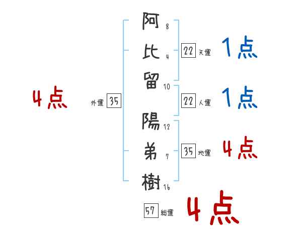 人運![]() | 阿比留陽弟樹さんの人運は22画の1つ星!努力することが苦手ないっぽう手先が器用。芸術性にも優れる。 性格や才能などを表す2番目に重要な運勢です。人間関係や協調性、社会的な成功に影響します。主に20歳から50歳ぐらいまでの中年期の運勢を表します。 |