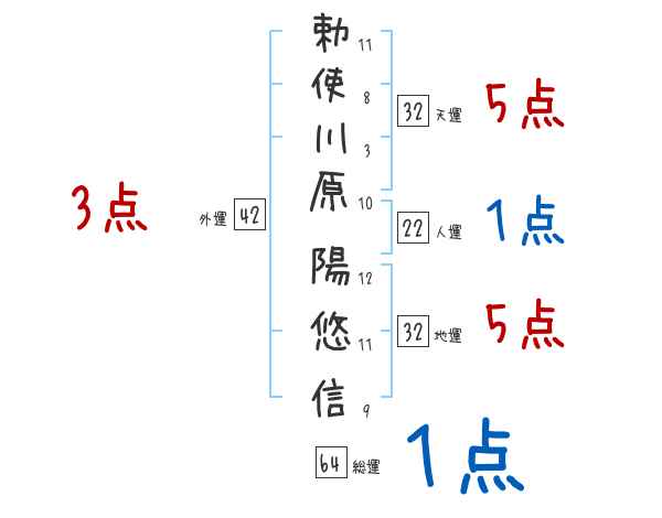 天運![]() | 勅使川原陽悠信さんの天運は32画の5つ星!柔軟性があり成功する。チャンスが多く金運が良い。 家系が持つ宿命的な運勢を表します。祖先から受け継いだ苗字ですので自分の力が及びません。家柄を象徴します。 |
