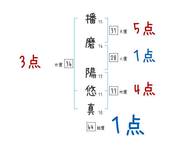 外運![]() | 播磨陽悠真さんの外運は36画の3つ星!先見性が豊かです。多少神経質で苦労することも。 生活面を象徴する運勢です。外部から受ける影響力を表し、結婚運、家庭運や職場、環境への順応性を表します。 |