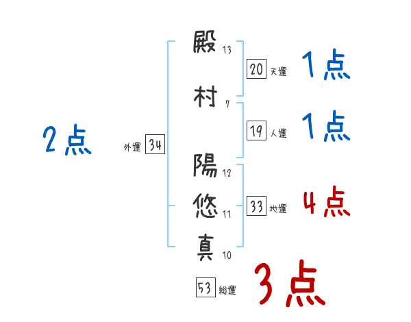 外運![]() | 殿村陽悠真さんの外運は34画の2つ星!独創性に優れるが、自尊心が強く災難に注意しましょう。 生活面を象徴する運勢です。外部から受ける影響力を表し、結婚運、家庭運や職場、環境への順応性を表します。 |
