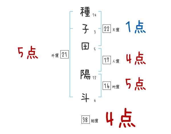 外運![]() | 種子田陽斗さんの外運は21画の5つ星!統率力がある。独立し成功する。名誉を手に入れる。 生活面を象徴する運勢です。外部から受ける影響力を表し、結婚運、家庭運や職場、環境への順応性を表します。 |