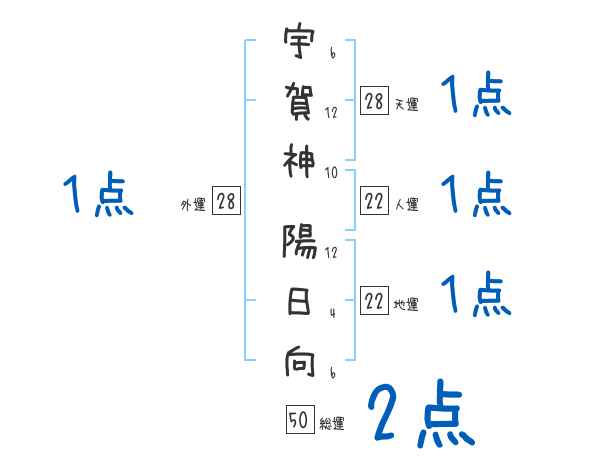 外運![]() | 宇賀神陽日向さんの外運は28画の1つ星!家庭環境に注意。スポーツで活躍できる能力があるかも。 生活面を象徴する運勢です。外部から受ける影響力を表し、結婚運、家庭運や職場、環境への順応性を表します。 |