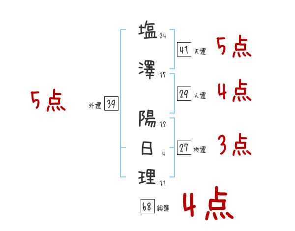 外運![]() | 塩澤陽日理さんの外運は39画の5つ星!社交性に優れ人望が厚い。人の上に立ち成功する。 生活面を象徴する運勢です。外部から受ける影響力を表し、結婚運、家庭運や職場、環境への順応性を表します。 |