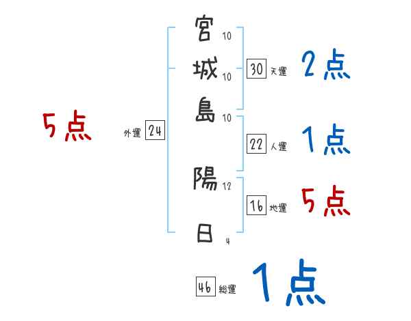 総運![]() | 宮城島陽日さんの総運は46画の1つ星!迷走することが多く苦労するかも。目先のことにとらわれないように。 あなたの人生を表す1番重要な運勢です。生涯を通じて影響する総合運となり、主に50歳以降の晩年期に影響を及ぼします。 |