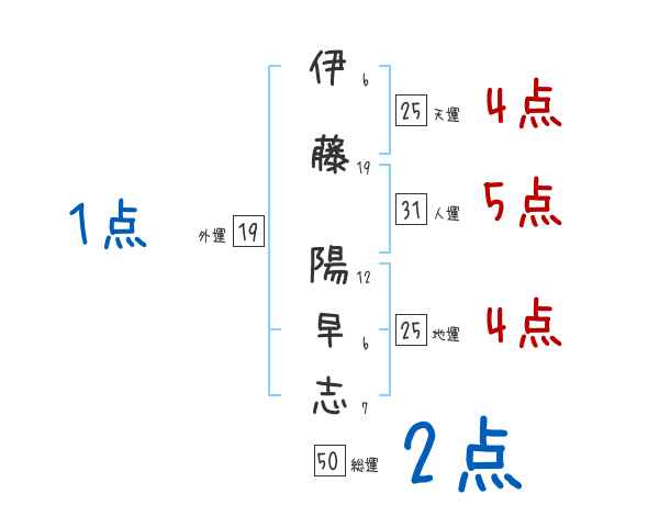 外運![]() | 伊藤陽早志さんの外運は19画の1つ星!優れた才能を持ちますが、協調性が足りないことも。周りの人と協力する事を意識しましょう。 生活面を象徴する運勢です。外部から受ける影響力を表し、結婚運、家庭運や職場、環境への順応性を表します。 |