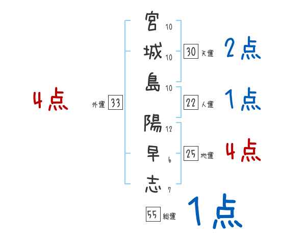 外運![]() | 宮城島陽早志さんの外運は33画の4つ星!権力志向でプライドが高い。勇気があり運を切り開き成功する。 生活面を象徴する運勢です。外部から受ける影響力を表し、結婚運、家庭運や職場、環境への順応性を表します。 |