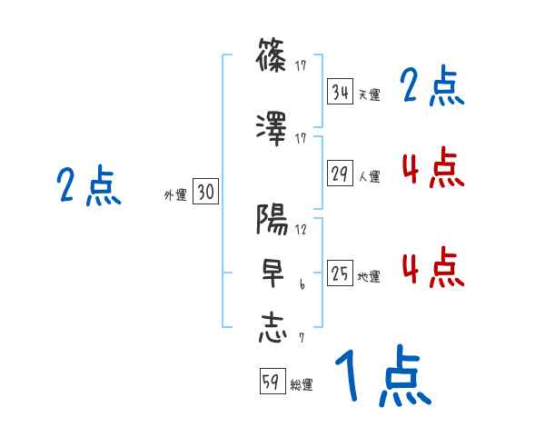 総運![]() | 篠澤陽早志さんの総運は59画の1つ星!意志の弱さであきらめることが多いかも。粘り強さが必要。 あなたの人生を表す1番重要な運勢です。生涯を通じて影響する総合運となり、主に50歳以降の晩年期に影響を及ぼします。 |