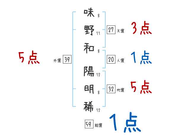 外運![]() | 味野和陽明稀さんの外運は39画の5つ星!社交性に優れ人望が厚い。人の上に立ち成功する。 生活面を象徴する運勢です。外部から受ける影響力を表し、結婚運、家庭運や職場、環境への順応性を表します。 |