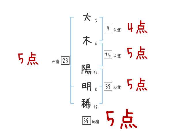 外運![]() | 大木陽明稀さんの外運は23画の5つ星!想像力に優れ活力がある。一代で成功し名誉を手に入れる。 生活面を象徴する運勢です。外部から受ける影響力を表し、結婚運、家庭運や職場、環境への順応性を表します。 |