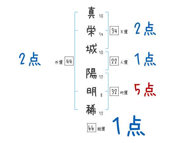 外運![]() | 真栄城陽明稀さんの外運は44画の2つ星!誠実で慎重な性格。物事を考えすぎないように注意しましょう。 生活面を象徴する運勢です。外部から受ける影響力を表し、結婚運、家庭運や職場、環境への順応性を表します。 |