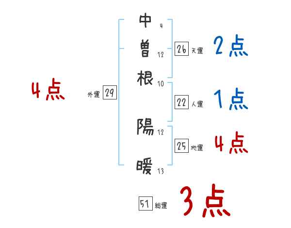 外運![]() | 中曽根陽暖さんの外運は29画の4つ星!完全主義で才能がある。厳格な心の持ち主。 生活面を象徴する運勢です。外部から受ける影響力を表し、結婚運、家庭運や職場、環境への順応性を表します。 |