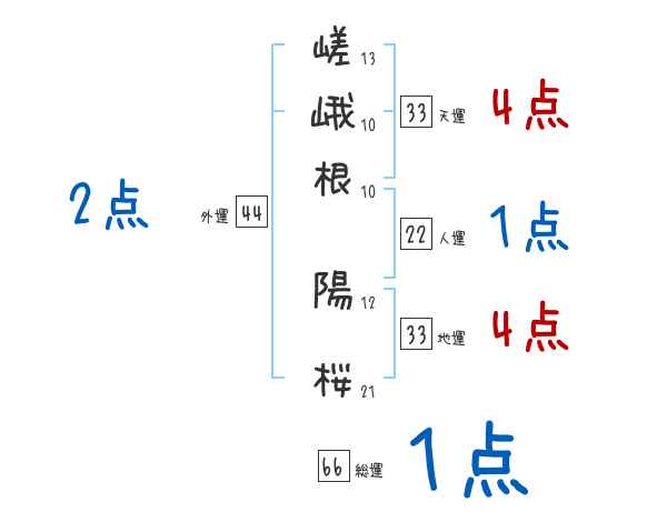 人運![]() | 嵯峨根陽桜さんの人運は22画の1つ星!努力することが苦手ないっぽう手先が器用。芸術性にも優れる。 性格や才能などを表す2番目に重要な運勢です。人間関係や協調性、社会的な成功に影響します。主に20歳から50歳ぐらいまでの中年期の運勢を表します。 |
