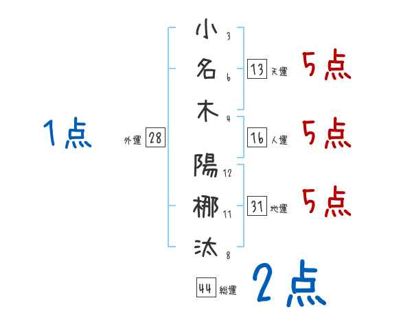 人運![]() | 小名木陽梛汰さんの人運は16画の5つ星!人望が厚く大きく発展する。逆転成功が見える。 性格や才能などを表す2番目に重要な運勢です。人間関係や協調性、社会的な成功に影響します。主に20歳から50歳ぐらいまでの中年期の運勢を表します。 |