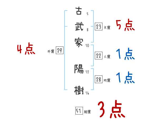 天運![]() | 古武家陽樹さんの天運は23画の5つ星!想像力に優れ活力がある。一代で成功し名誉を手に入れる。 家系が持つ宿命的な運勢を表します。祖先から受け継いだ苗字ですので自分の力が及びません。家柄を象徴します。 |
