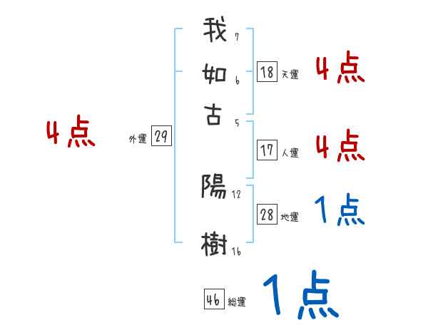 外運![]() | 我如古陽樹さんの外運は29画の4つ星!完全主義で才能がある。厳格な心の持ち主。 生活面を象徴する運勢です。外部から受ける影響力を表し、結婚運、家庭運や職場、環境への順応性を表します。 |