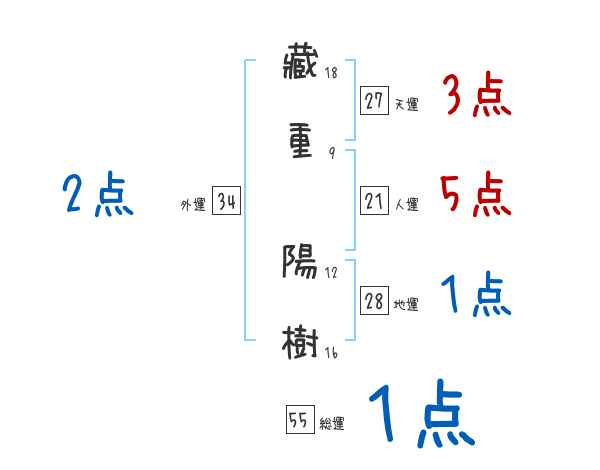 人運![]() | 藏重陽樹さんの人運は21画の5つ星!統率力がある。独立し成功する。名誉を手に入れる。 性格や才能などを表す2番目に重要な運勢です。人間関係や協調性、社会的な成功に影響します。主に20歳から50歳ぐらいまでの中年期の運勢を表します。 |