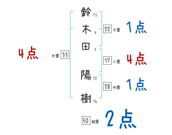 総運![]() | 鈴木田陽樹さんの総運は50画の2つ星!浮き沈みが激しく不安定。しりすぼみに衰退しやすいので注意しましょう。 あなたの人生を表す1番重要な運勢です。生涯を通じて影響する総合運となり、主に50歳以降の晩年期に影響を及ぼします。 |