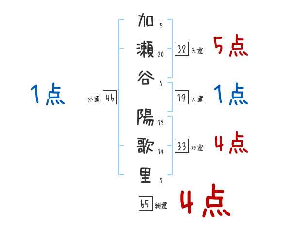 天運![]() | 加瀬谷陽歌里さんの天運は32画の5つ星!柔軟性があり成功する。チャンスが多く金運が良い。 家系が持つ宿命的な運勢を表します。祖先から受け継いだ苗字ですので自分の力が及びません。家柄を象徴します。 |