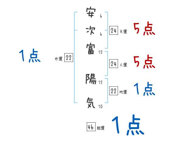 天運![]() | 安次富陽気さんの天運は24画の5つ星!家庭運が良く順調な人生。金運にも恵まれる。 家系が持つ宿命的な運勢を表します。祖先から受け継いだ苗字ですので自分の力が及びません。家柄を象徴します。 |