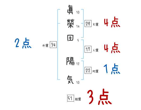 外運![]() | 眞榮田陽気さんの外運は34画の2つ星!独創性に優れるが、自尊心が強く災難に注意しましょう。 生活面を象徴する運勢です。外部から受ける影響力を表し、結婚運、家庭運や職場、環境への順応性を表します。 |