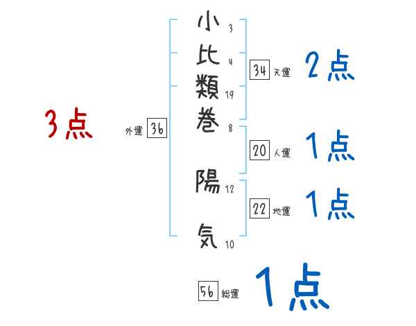 外運![]() | 小比類巻陽気さんの外運は36画の3つ星!先見性が豊かです。多少神経質で苦労することも。 生活面を象徴する運勢です。外部から受ける影響力を表し、結婚運、家庭運や職場、環境への順応性を表します。 |