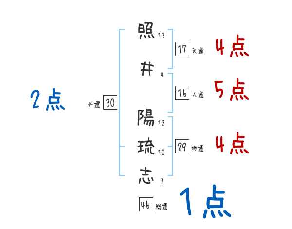 人運![]() | 照井陽琉志さんの人運は16画の5つ星!人望が厚く大きく発展する。逆転成功が見える。 性格や才能などを表す2番目に重要な運勢です。人間関係や協調性、社会的な成功に影響します。主に20歳から50歳ぐらいまでの中年期の運勢を表します。 |
