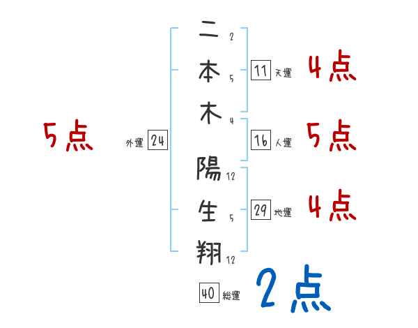 人運![]() | 二本木陽生翔さんの人運は16画の5つ星!人望が厚く大きく発展する。逆転成功が見える。 性格や才能などを表す2番目に重要な運勢です。人間関係や協調性、社会的な成功に影響します。主に20歳から50歳ぐらいまでの中年期の運勢を表します。 |