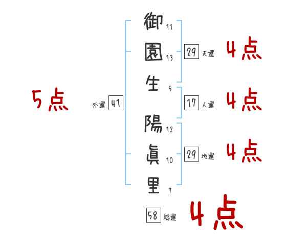 総運![]() | 御園生陽眞里さんの総運は58画の4つ星!安定した生活。大器晩成タイプ。 あなたの人生を表す1番重要な運勢です。生涯を通じて影響する総合運となり、主に50歳以降の晩年期に影響を及ぼします。 |