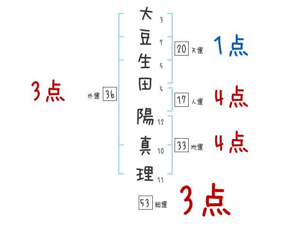 総運![]() | 大豆生田陽真理さんの総運は53画の3つ星!やや見栄っ張りで虚栄心がある。散財に注意。 あなたの人生を表す1番重要な運勢です。生涯を通じて影響する総合運となり、主に50歳以降の晩年期に影響を及ぼします。 |