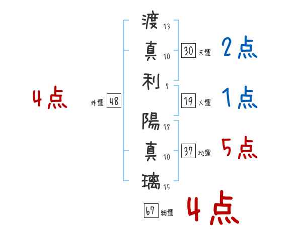 天運![]() | 渡真利陽真璃さんの天運は30画の2つ星!浮き沈みの激しさに注意しましょう。 家系が持つ宿命的な運勢を表します。祖先から受け継いだ苗字ですので自分の力が及びません。家柄を象徴します。 |