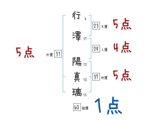 天運![]() | 行澤陽真璃さんの天運は23画の5つ星!想像力に優れ活力がある。一代で成功し名誉を手に入れる。 家系が持つ宿命的な運勢を表します。祖先から受け継いだ苗字ですので自分の力が及びません。家柄を象徴します。 |