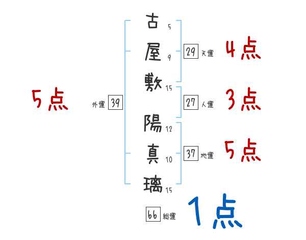 天運![]() | 古屋敷陽真璃さんの天運は29画の4つ星!完全主義で才能がある。厳格な心の持ち主。 家系が持つ宿命的な運勢を表します。祖先から受け継いだ苗字ですので自分の力が及びません。家柄を象徴します。 |