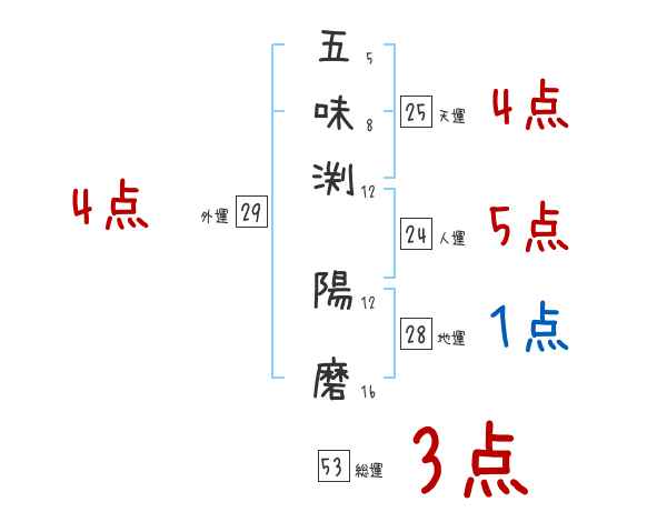 天運![]() | 五味渕陽磨さんの天運は25画の4つ星!個性があり才能があふれる。強運の持ち主で発展する。 家系が持つ宿命的な運勢を表します。祖先から受け継いだ苗字ですので自分の力が及びません。家柄を象徴します。 |