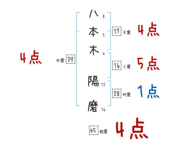 人運![]() | 八本木陽磨さんの人運は16画の5つ星!人望が厚く大きく発展する。逆転成功が見える。 性格や才能などを表す2番目に重要な運勢です。人間関係や協調性、社会的な成功に影響します。主に20歳から50歳ぐらいまでの中年期の運勢を表します。 |