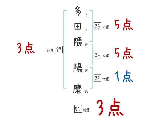 天運![]() | 多田隈陽磨さんの天運は23画の5つ星!想像力に優れ活力がある。一代で成功し名誉を手に入れる。 家系が持つ宿命的な運勢を表します。祖先から受け継いだ苗字ですので自分の力が及びません。家柄を象徴します。 |